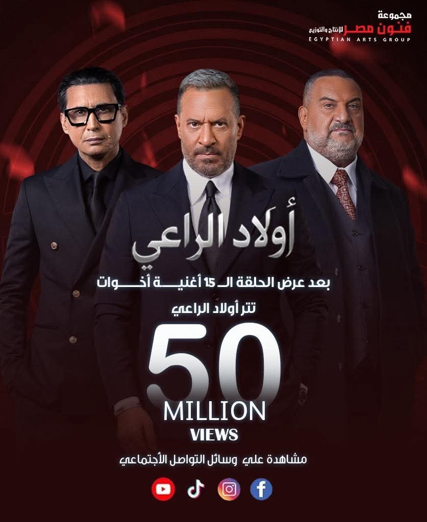 “50 مليون مشاهدة على وسائل التواصل الاجتماعي.. بعد عرض الحلقة 15، أغنية (أخوات) تحقق نجاحاً جديداً يضاف لمسيرة مسلسل أولاد الراعي.. فخورون بردود الفعل الكبيرة، وشكراً لكل من كان جزءاً من هذا النجاح”.