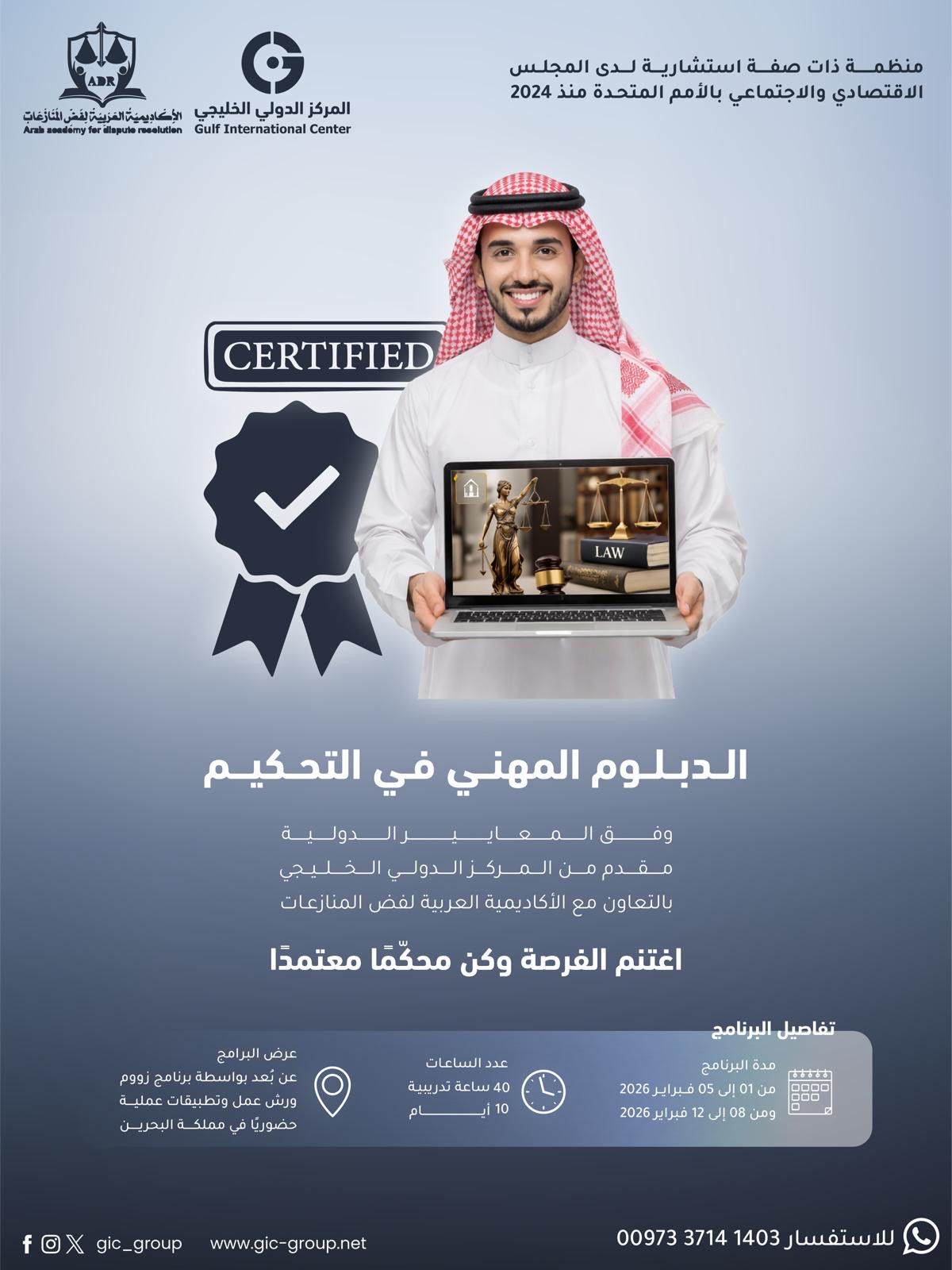 • أعلن المركز الدولي الخليجي، عن إطلاق الدبلوم المهني في التحكيم وفق المعايير الدولية، بالتعاون مع الأكاديمية العربية لفض المنازعات، كبرنامج تدريبي متخصص يواكب التطور المتسارع في الفكر القانوني المعاصر، ويستجيب للحاجة المتنامية إلى آليات فعالة ومرنة لفض المنازعات خارج إطار القضاء التقليدي، ولا سيما في المجال التجاري الدولي الذي بات يعتمد بشكل متزايد على التحكيم كخيار استراتيجي لتحقيق العدالة الناجزة.