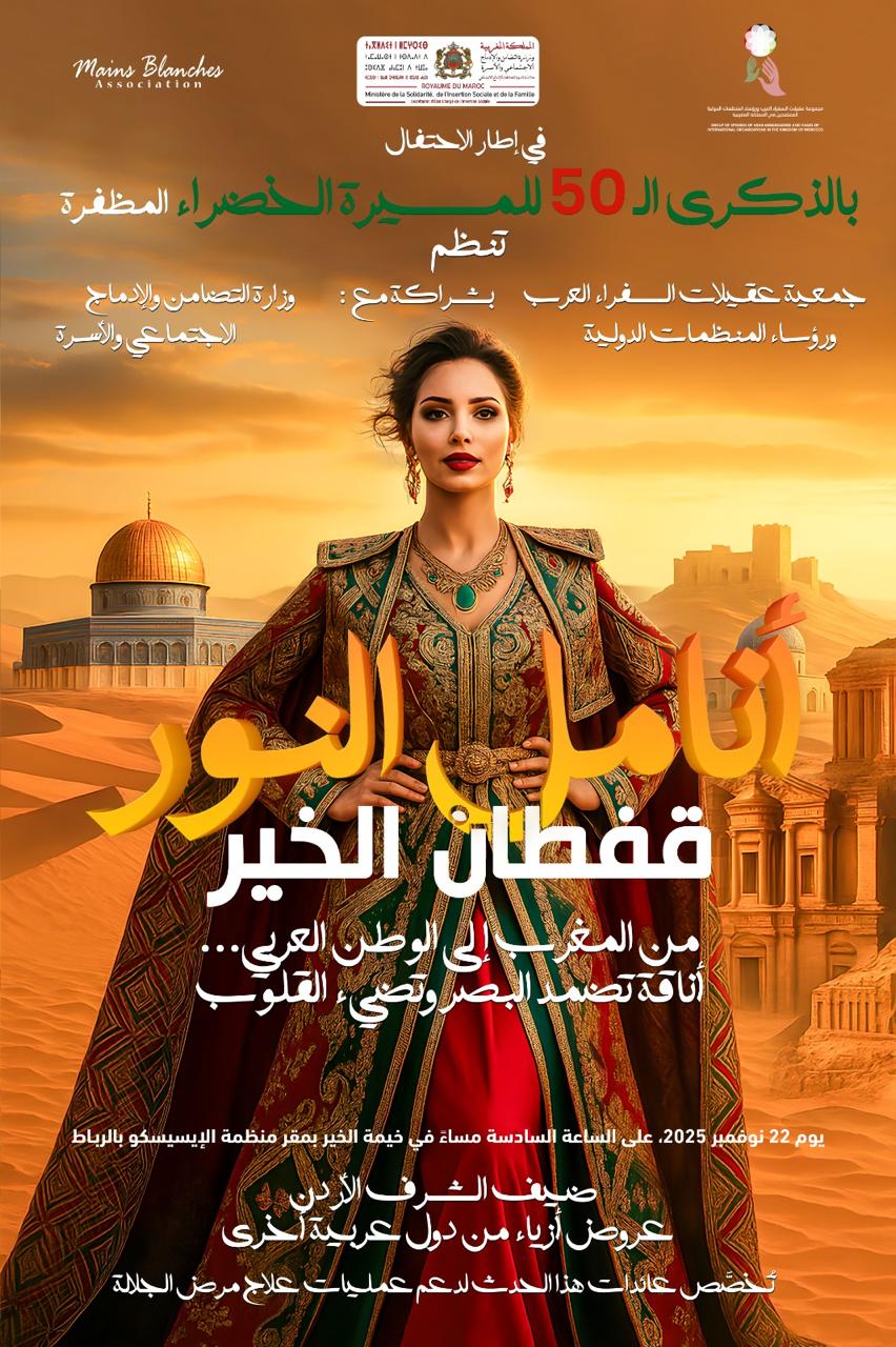 • *الرباط –* في إطار الاحتفال بالذكرى الخمسين للمسيرة الخضراء المظفرة، تستعد مدينة الرباط، بخيمة الخير في مقر *منظمة الإيسيسكو*، يوم *22 نوفمبر*، لاحتضان أمسية مميزة تجمع بين الأناقة المغربية والبعد الإنساني، من خلال حدث خيري تنظمه *جمعية عقيلات السفراء العرب ورؤساء المنظمات الدولية*، بشراكة مع *وزارة التضامن والإدماج الاجتماعي وجمعية الأيادي البيضاء.*