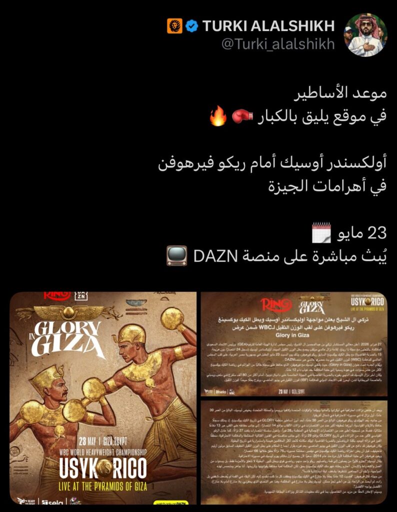 أعلن المستشار تركي آل الشيخ عن إقامة نزال عالمي مرتقب يوم 23 مايو 2026 في مصر، يقام علي سفح الاهرامات ويجمع بطل العالم في الوزن الثقيل الموحّد أوليكساندر أوسيك مع بطل الكيك بوكسينغ ريكو فيرهوفن على لقب (WBC) للوزن الثقيل، ضمن عرض Glory in Giza وبث حصري عالمي عبر منصة DAZN.