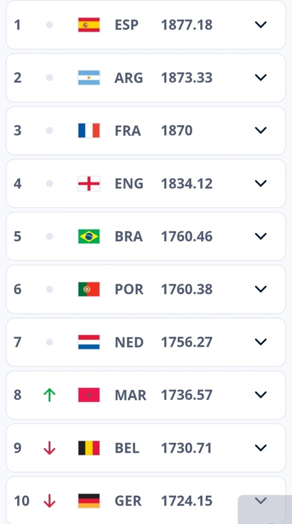 على الصعيد العالمي، ما زالت إسبانيا تحتل المركز الأول، تليها الأرجنتين وفرنسا، فيما حافظت إنجلترا على ترتيبها في المركز الرابع.