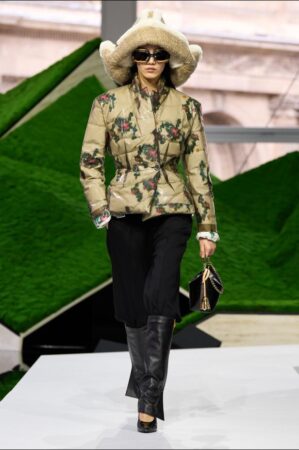 وتفتحت الزخارف النباتية على صدور الفساتين وكأنها لوحات انطباعية فيما أضفت مربعات التارتان الفولكلورية بعدا تراثيا حميميا معززا بذلك شعورا بالانتماء لأرض لم تطأها الأقدام بعد واشتغلت لوحة الألوان كلوحة زيتية لمشهد غروب شتوي حيث تراقصت درجات الأخضر الصنوبري القاتم مع بني التربة الخصيب وتخللها رمادي الصخور الصلدة لتشتعل التوليفة فجأة بومضات من الأحمر القاني ولمعان المعادن الخافتة التي تعكس وهج الشفق الأخير أما الأقمشة فقد تنوعت تنوعا ثريا بين الفرو النباتي الوارف والجلود المعالجة التي تحاكي ملمس الخشب العتيق وامتزجت خشونة الجينز برقة الشيفون وانسيابية الحرير في توليفة تحتفي بتعدد تضاريس العالم الطبيعي ولم تغب الإكسسوارات عن هذا المشهد الملحمي فقد تربعت الحقائب على عرش العرض وكأنها رفيقة درب المستكشف العصري فبدت حقائب الرحلات الضخمة بحجمها المهيب وكأنها تحمل أسرار المسافر الأبدي بينما عادت أيقونة الدار حقيبة النويه التي أبصرت النور لأول مرة 1932
