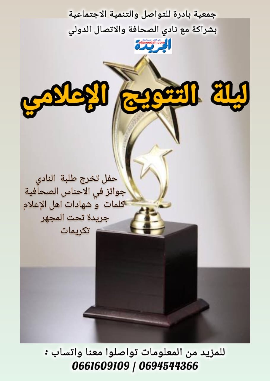 • اختفالا بذكرى عيد العرش المجيد ، تنظم جمعية بادرة للتواصل والتنمية الاجتماعية بشراكة مع نادي الصحافة والاتصال الدولي و جريدة الجريدة بوان كوم تظاهرة وطنية عربية تحت عنوان : ليلة التتويج الإعلامي .
