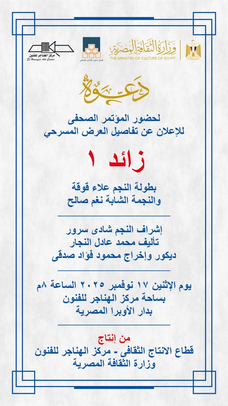 17 نوفمبر.. موعد المؤتمر الصحفي للإعلان عن العرض المسرحي «زائد واحد»